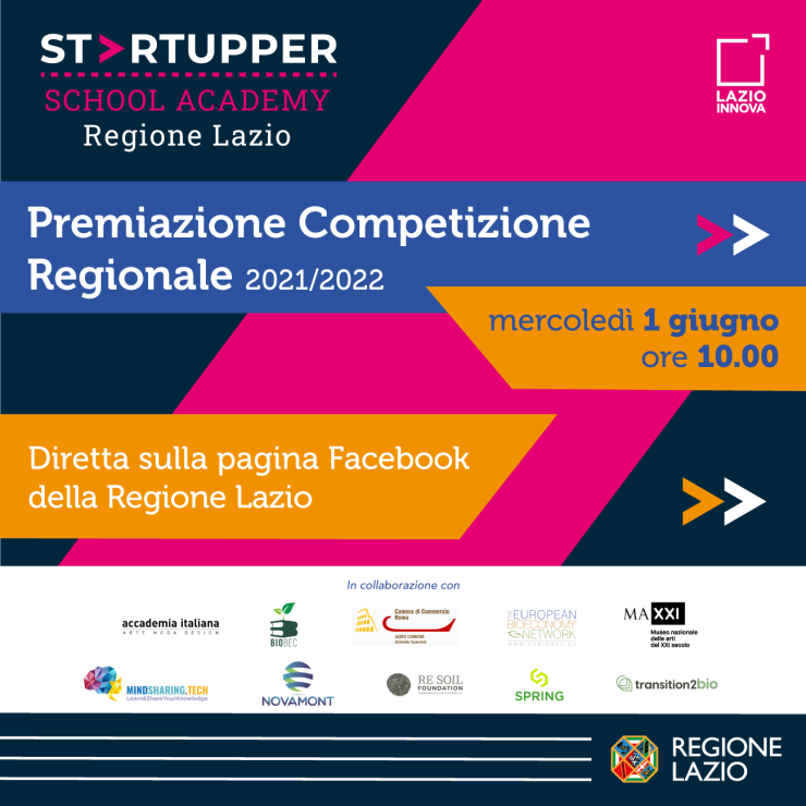 “Il nostro obiettivo è da sempre quello di supportare le scuole e stimolare la propensione al fare impresa. Siamo orgogliosi del lavoro fatto insieme con i professori e con i partner che ogni anno collaborano con noi. Un plauso agli studenti che hanno mostrato impegno, perseveranza e creatività, seppure in un momento difficile come quello che stiamo vivendo, mettendosi in gioco con spirito collaborativo e dando vita a progetti di grande interesse e innovazione” ha concluso il Presidente di Lazio Innova Nicola Tasco.